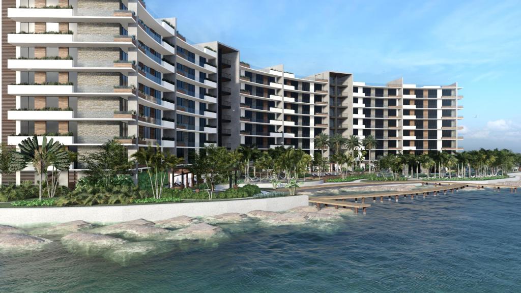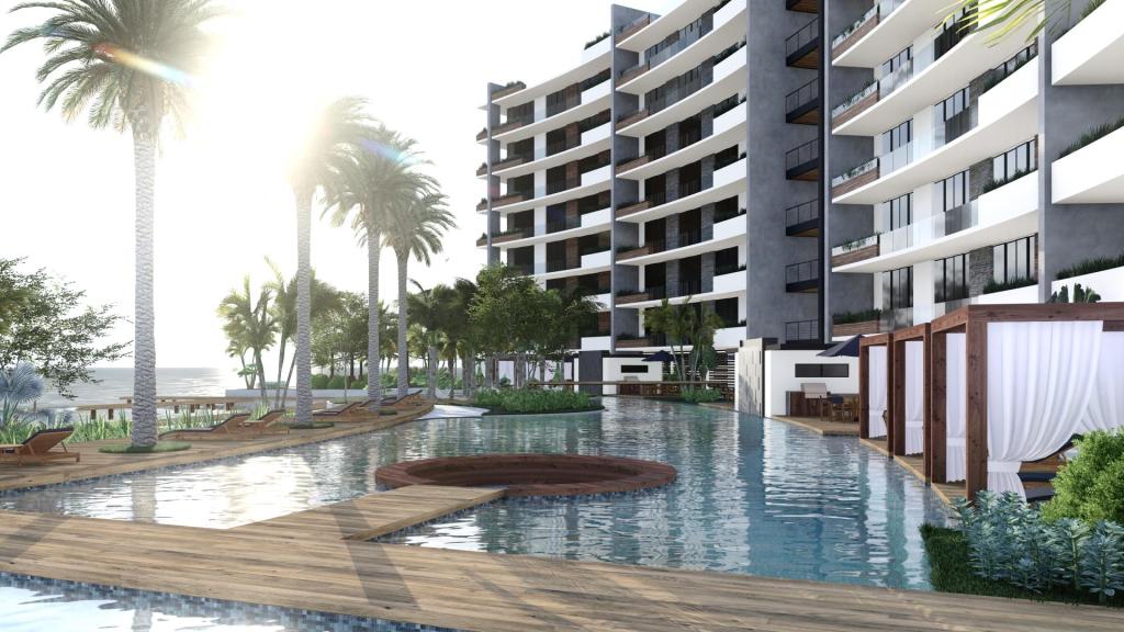 Inside, each residence is designed as a large‑format ocean‑front home, with living areas and bedrooms oriented to the sea and generous terraces that extend the living space outdoors. Finishes emphasize coastal durability and contemporary aesthetics: large‑format porcelain or engineered wood floors, modern kitchens with quartz countertops, high‑quality cabinetry, and bathrooms with porcelain tiling, glass shower enclosures and water‑saving fixtures. Terraces feature non‑slip porcelain, laminated glass railings and exterior‑grade electrical and water points for comfort and easy maintenance.