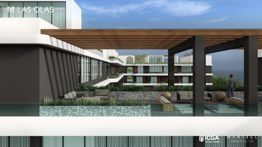 Las Olas is a resort‑style, mid‑rise condominium community planned in St. James, Jamaica, organized around a landscaped water courtyard. The concept integrates underground/ground parking, a main lobby and business center, squash courts, indoor‑outdoor leisure at the podium, five residential levels plus penthouses, and rooftop gardens. The residential program totals 68 homes ranging from lofts to penthouses, designed for everyday livability in a sophisticated coastal setting.